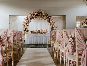The Penelope Range seamlessly transitions from ceremony to reception. Picture your ceremony under a romantic floral arch framed by soft candlelight and chairs dressed with elegant details. As guests enter the reception, they are greeted by cascading floral centrepieces and candles glowing atop beautifully set tables. The soft palette of pastels with green foliage keeps the decor understated yet luxurious, ensuring your wedding looks refined and cohesive from start to finish.