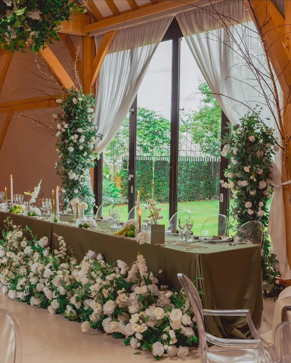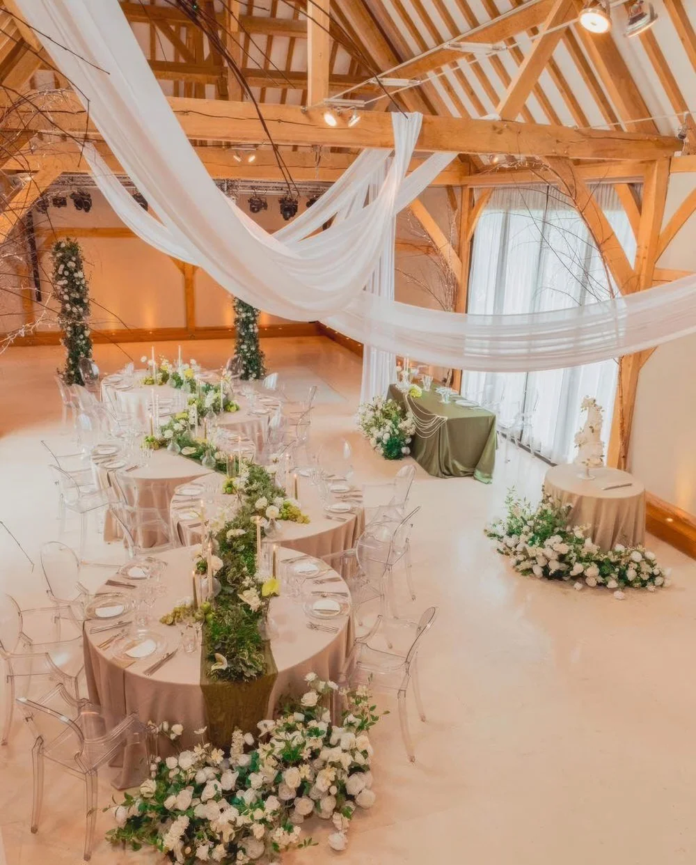 The tables were adorned with abundant fresh florals, including cascading arrangements of white roses, greenery, and delicate touches of gypsophila. The floral decor added softness and elegance and perfectly complemented the barn’s warm wooden beams. The arrangements included lush eucalyptus, ruscus, and ivy, adding layers of greenery that enhanced the venue’s natural beauty. The choice of white roses symbolized purity and love, setting a romantic tone for the entire event. Greenery was also used generously to bring an organic, natural feel to the decor, making the setup fresh and inviting.