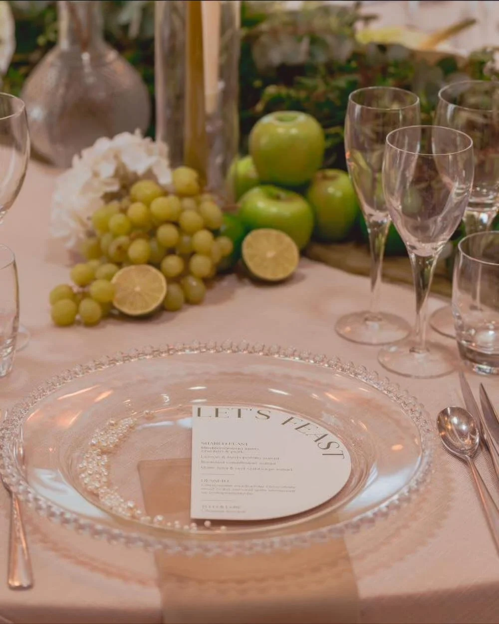 We chose elegant charger plates with beaded rims, crisp glassware, and simple yet beautiful stationery for the table setting. Each setting was designed to feel luxurious while staying true to the understated elegance of the entire setup. The beaded charger plates added just the right amount of sparkle, catching the light and adding a touch of glamour to the table without overwhelming the other details. The stationery was kept minimal yet stylish, with soft colours and elegant fonts aligned perfectly with the theme.