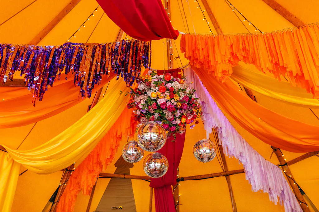 From ribbons flowing from ceremony chairs to streamers dancing across the ceiling and disco balls catching the light, this look is all about colour, movement, and pure happiness.