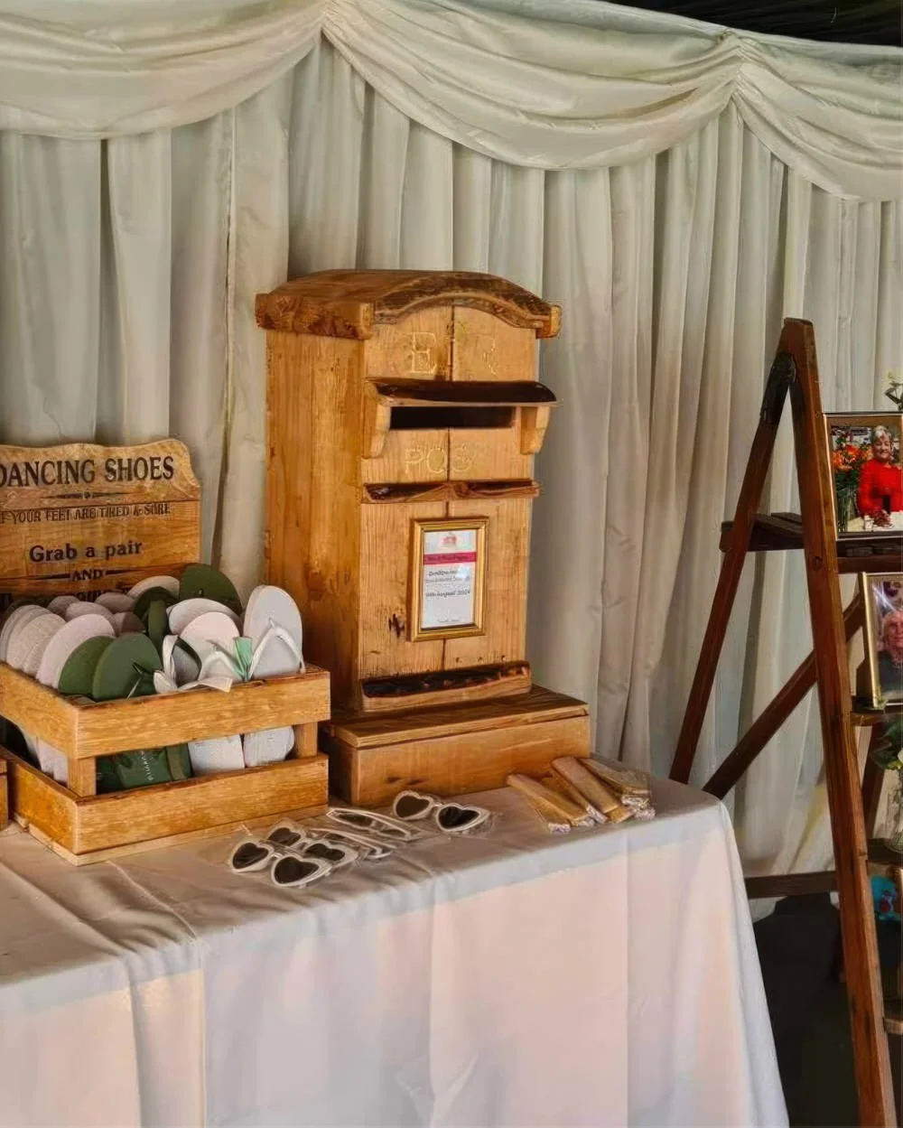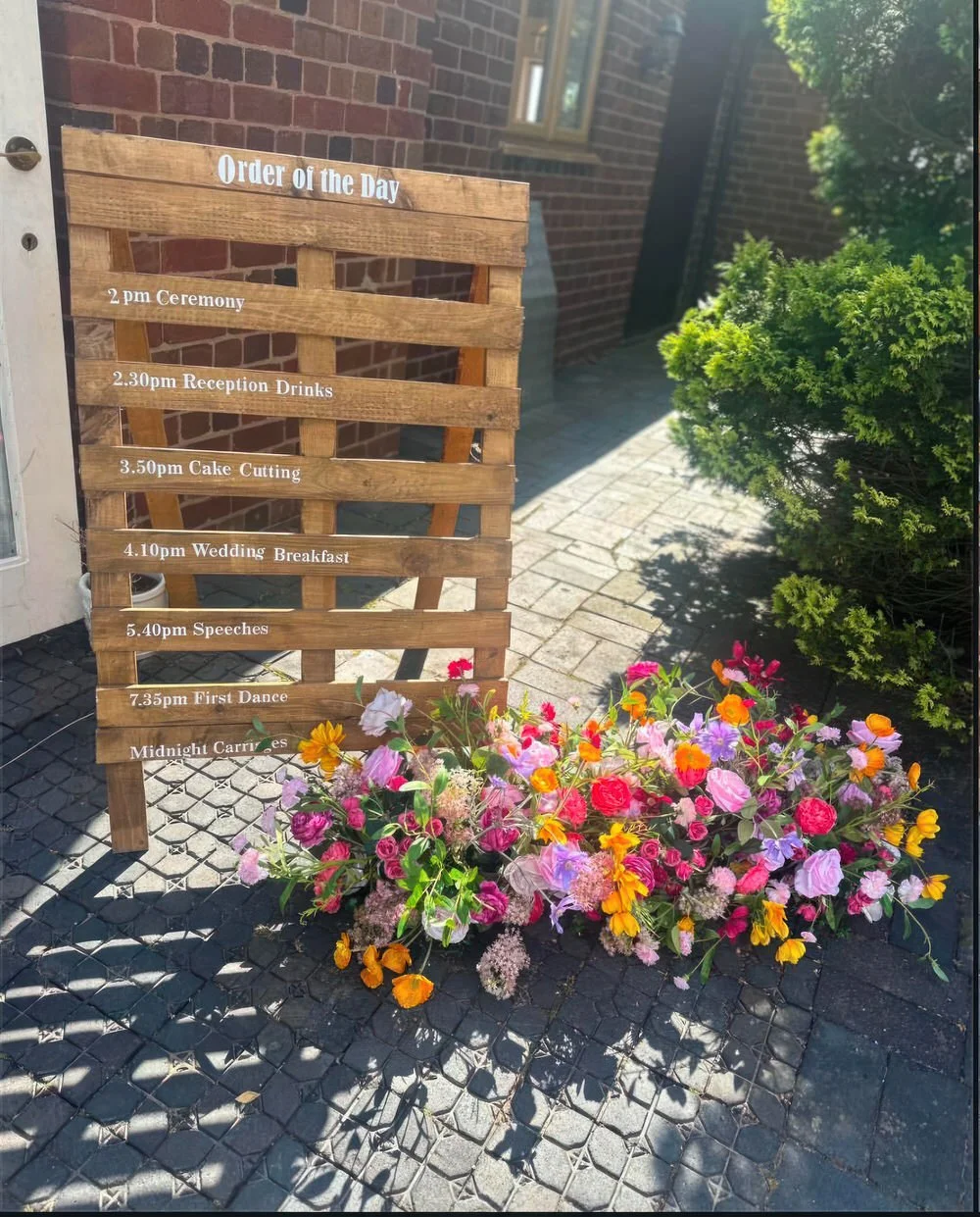 Start your celebration on the right note with a custom wooden pallet sign. Whether it’s an Order of the Day schedule or a heartfelt welcome message, these rustic touches set an inviting tone for your guests. Add lush florals or colourful accents to make them stand out beautifully.