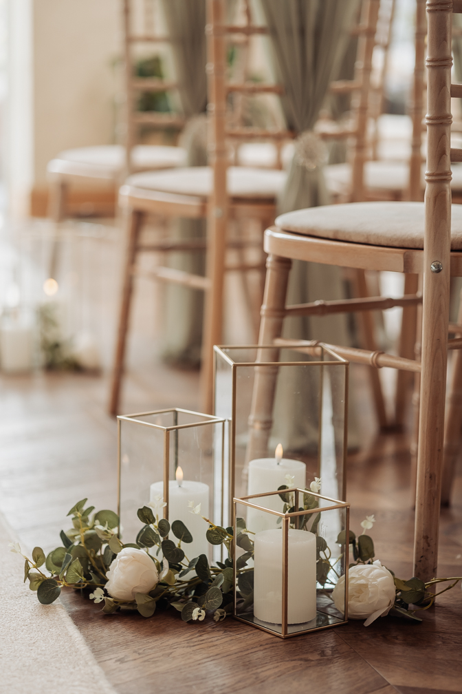 The Penelope Range seamlessly transitions from ceremony to reception. Picture your ceremony under a romantic floral arch framed by soft candlelight and chairs dressed with elegant details. As guests enter the reception, they are greeted by cascading floral centrepieces and candles glowing atop beautifully set tables. The soft palette of pastels with green foliage keeps the decor understated yet luxurious, ensuring your wedding looks refined and cohesive from start to finish.