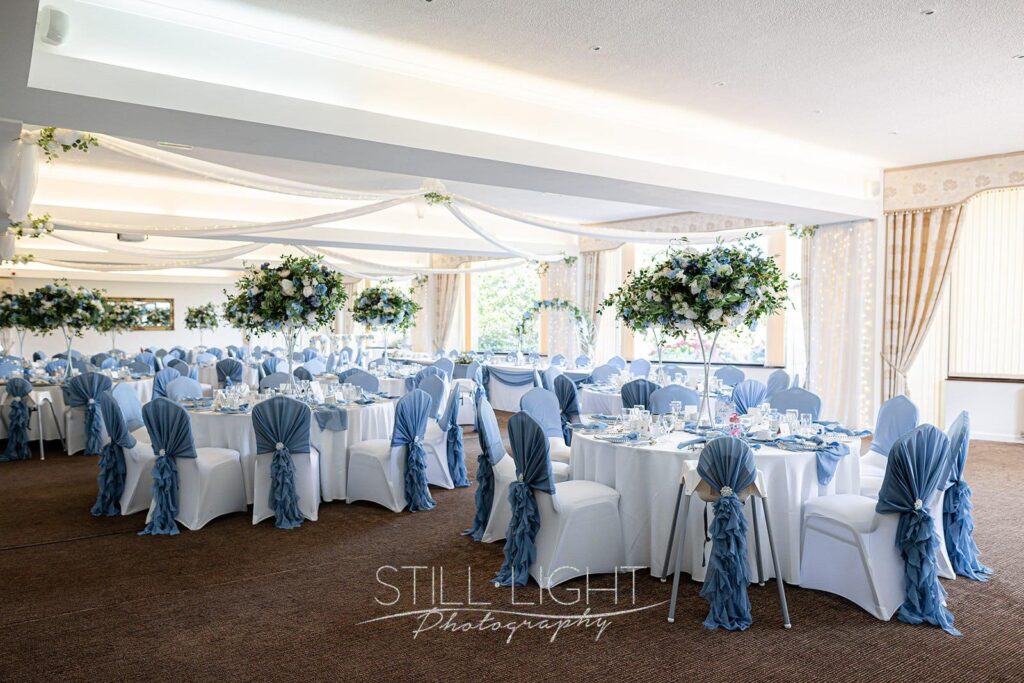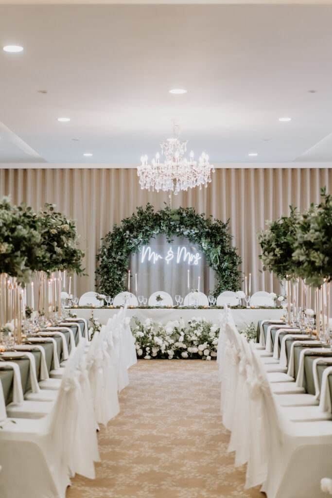 As evening wears on, the white LED dancefloor is the centre of celebration — creating a spellbinding glow that invites everyone to dance. The glittering lights add glamour and atmosphere, wonderfully complementing the styling details around the room.