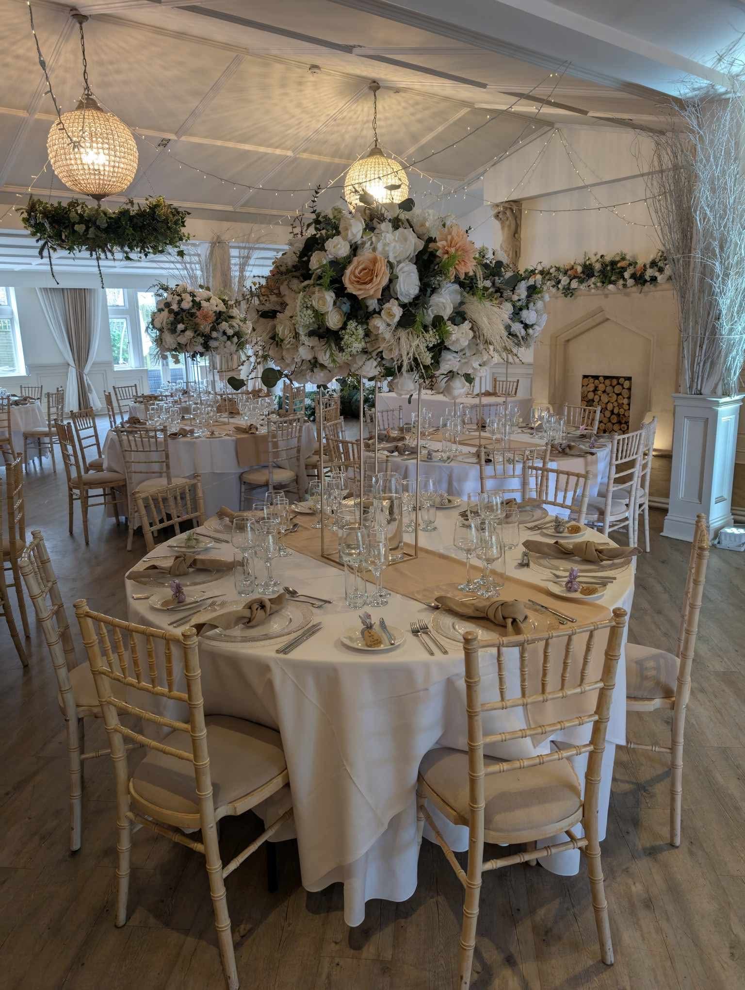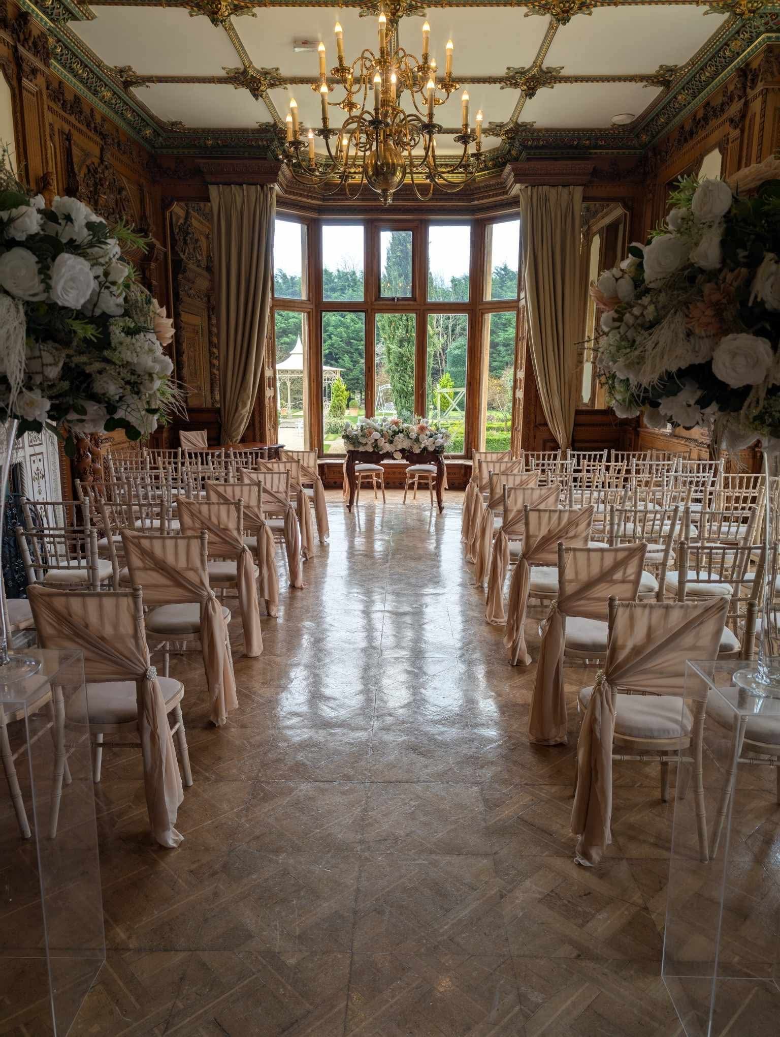 This indoor ceremony set up is styled here with simple aisle chair styling in a champagne, with tall florals at the start of the aisle and florals on the ceremony table.
